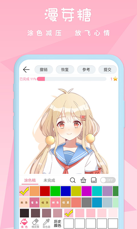 漫芽糖绘画是一个壁纸涂色软件,精美的界面,超多二次元人物壁纸,一键给二次元人物上色,漫芽糖,特色减压,放飞心情,一键上色,功能强大,点击上色,智能纹理,秒变大触,独立上色,超高自由度,展示自己的独一无二,丰富的创作方式,描绘心中的二次元世界。